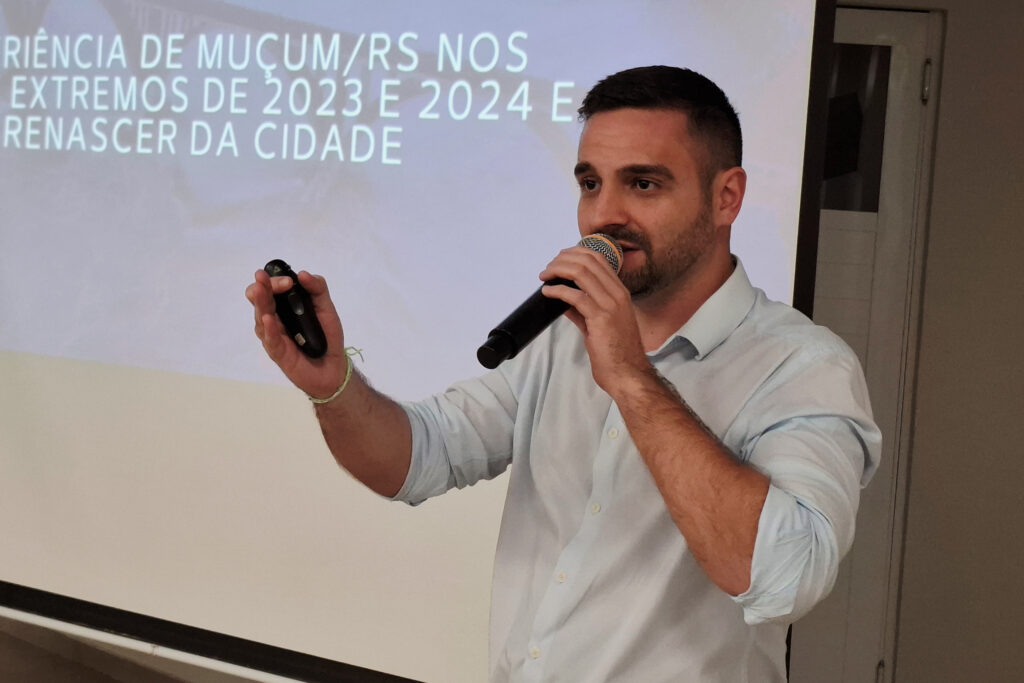 Na sequência, o prefeito de Muçum, Mateus Trojan, compartilhou sua experiência na gestão do município durante os eventos extremos de 2023 e 2024. A cidade tornou-se símbolo de resiliência, após enfrentar quatro desastres de grandes proporções incluindo temporal de granizo em abril de 2023 até a enchente histórica em maio de 2024.