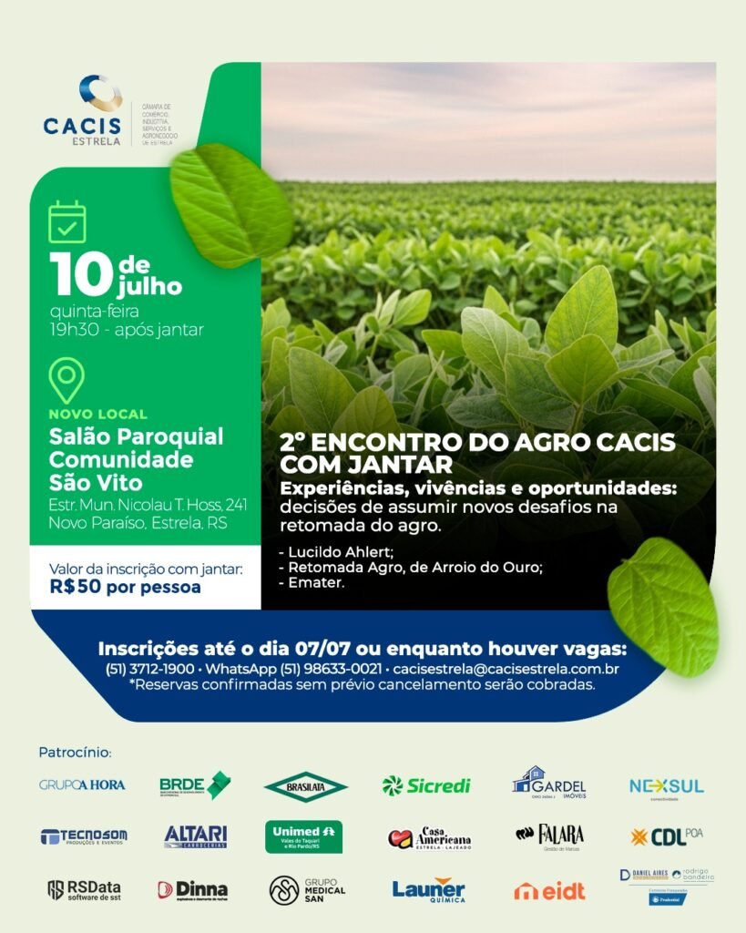 Estrela sedia, no próximo dia 10 de julho, a segunda edição do “Encontro do Agro” da Câmara de Comércio, Indústria, Serviços e Agronegócio de Estrela (Cacis). O evento, com jantar incluso, é mais uma iniciativa da pasta do “agronegócio” da entidade, e está agendado para ocorrer a partir das 19h30min, no Salão Paroquial da Comunidade São Vito, localizado na Estrada Municipal Nicolau T. Hoss, 241, na localidade de Novo Paraíso. As inscrições já estão abertas.