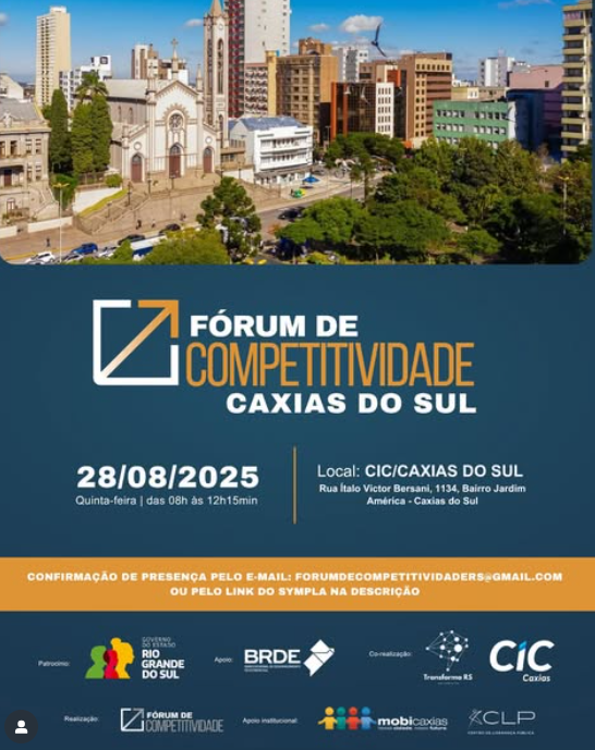 A Câmara de Indústria, Comércio e Serviços de Caxias do Sul (CIC Caxias) será sede da próxima edição do Fórum de Competitividade, que acontece na próxima quinta-feira (28), das 8h às 12h15. O encontro é uma realização do Fórum de Competitividade, em correalização com o Transforma RS e CIC Caxias, e conta com o patrocínio do governo do estado do Rio Grande do Sul.