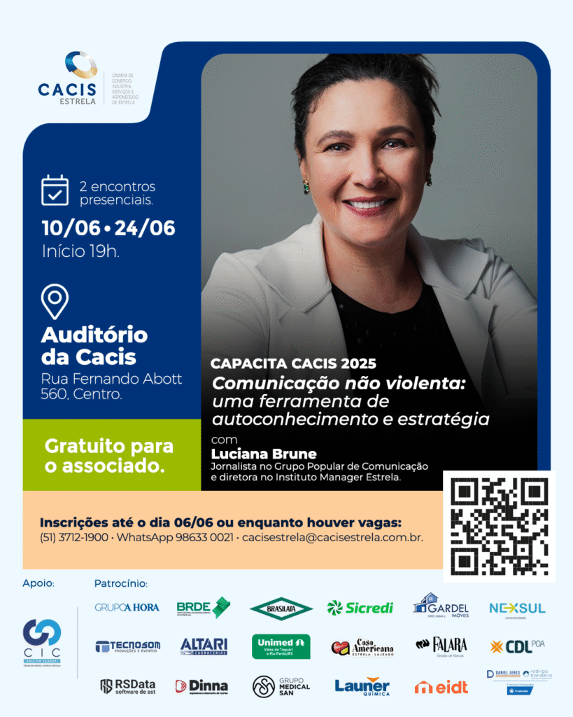 Já estão abertas as inscrições para o curso “Comunicação não violenta: uma ferramenta de autoconhecimento e estratégia”. O mesmo será ministrado pela comunicadora e empresária Luciana Brune, nas noites de 10/06 e 24/06. As inscrições podem ser confirmadas via QR Code do card, sendo gratuitas para associados e colaboradores dos mesmos. Demais vagas também podem ser encaminhadas pela comunidade em geral pelo mesmo QR Code ou junto ao Departamento de Eventos pelo telefone (51) 98465-0021. Informações também podem ser obtidas pelo 3712-1900 e e-mail cacisestrela@cacisestrela.com.br