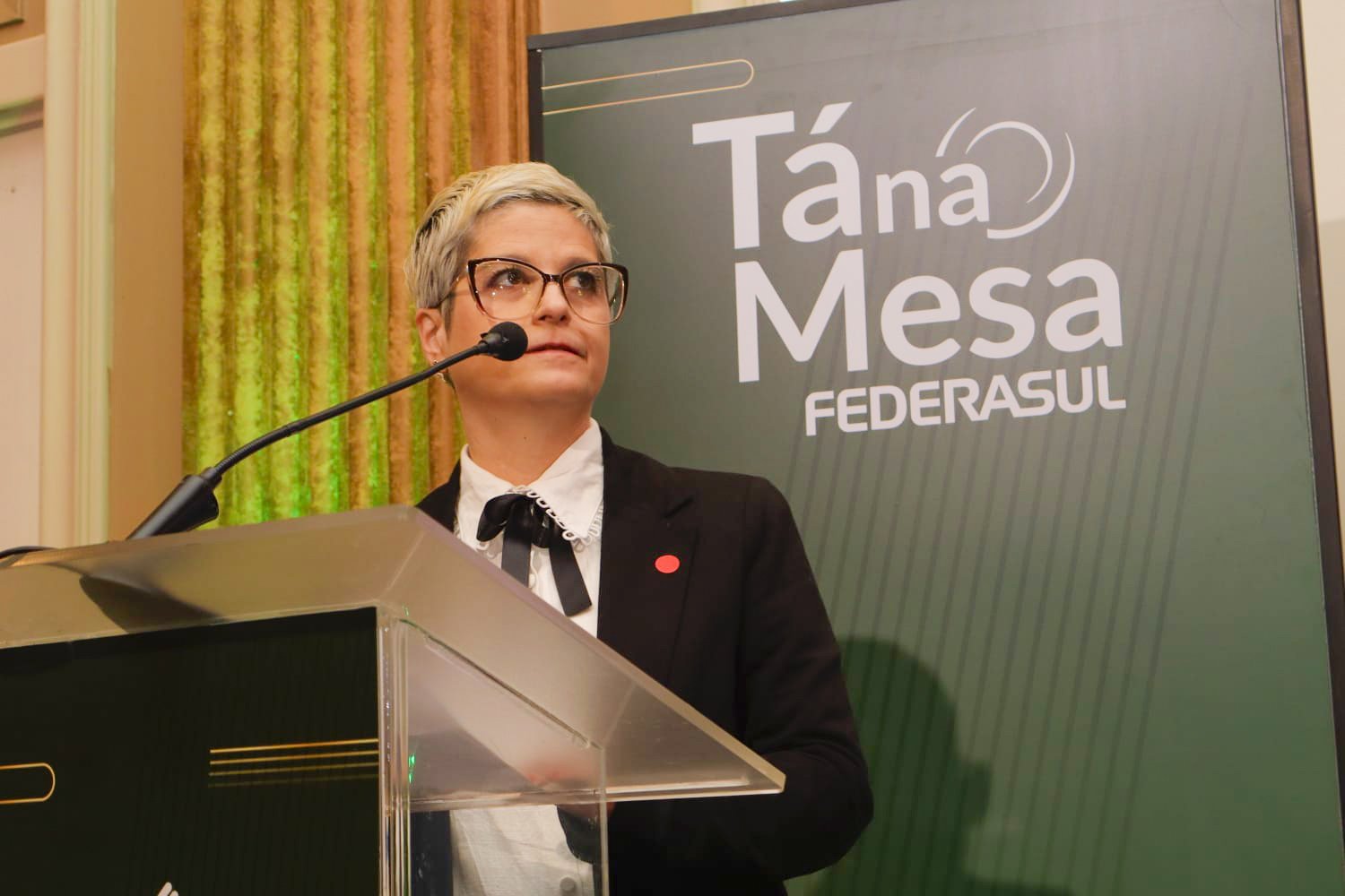 A FEDERASUL aproveitou o Tá na Mesa com os ex-governadores para mostrar o filme que resgata o arquétipo do guerreiro heróico, um conceito de branding, que é profundamente enraizado na cultura gaúcha, e pode ser utilizado na reconstrução de marcas e negócios.” “Precisamos resgatar essa bravura, de quem luta, de quem briga,” afirmou a publicitária, destacando a resiliência e a força características do povo do Rio Grande do Sul.