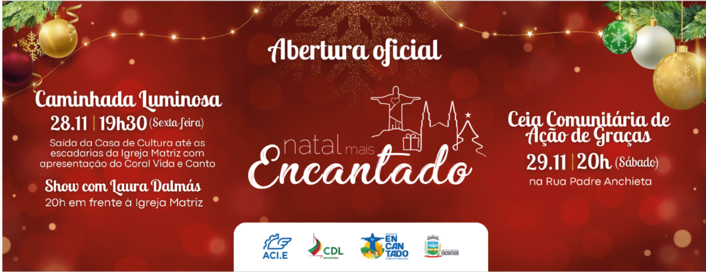 A abertura oficial do Natal Mais Encantado ocorre na sexta-feira, dia 28, às 19h30min. A comunidade está convidada a participar da Caminhada Luminosa, com saída da Casa de Cultura em direção às escadarias da Igreja Matriz, onde acontecerá a chegada do Papai Noel. O evento contará com apresentação do Coral Vida e Canto e show com Laura Dalmás, financiado pelo Pró-Cultura RS.