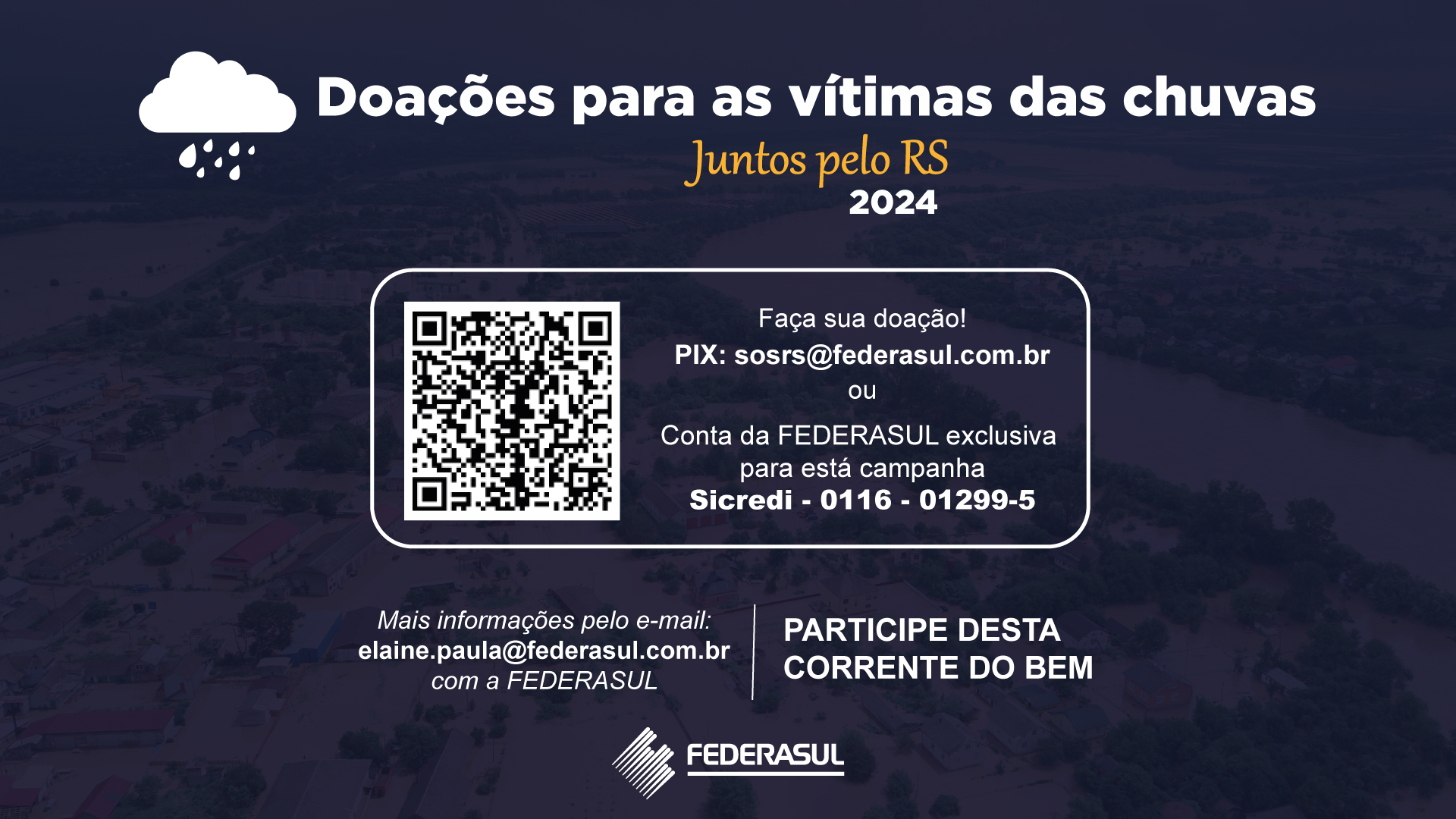 As doações podem ser feitas por PIX: sosrs@federasul.com.br ou através de depósito em conta da FEDERASUL aberta exclusivamente para a campanha no Sicredi nº 0116 01229-5.