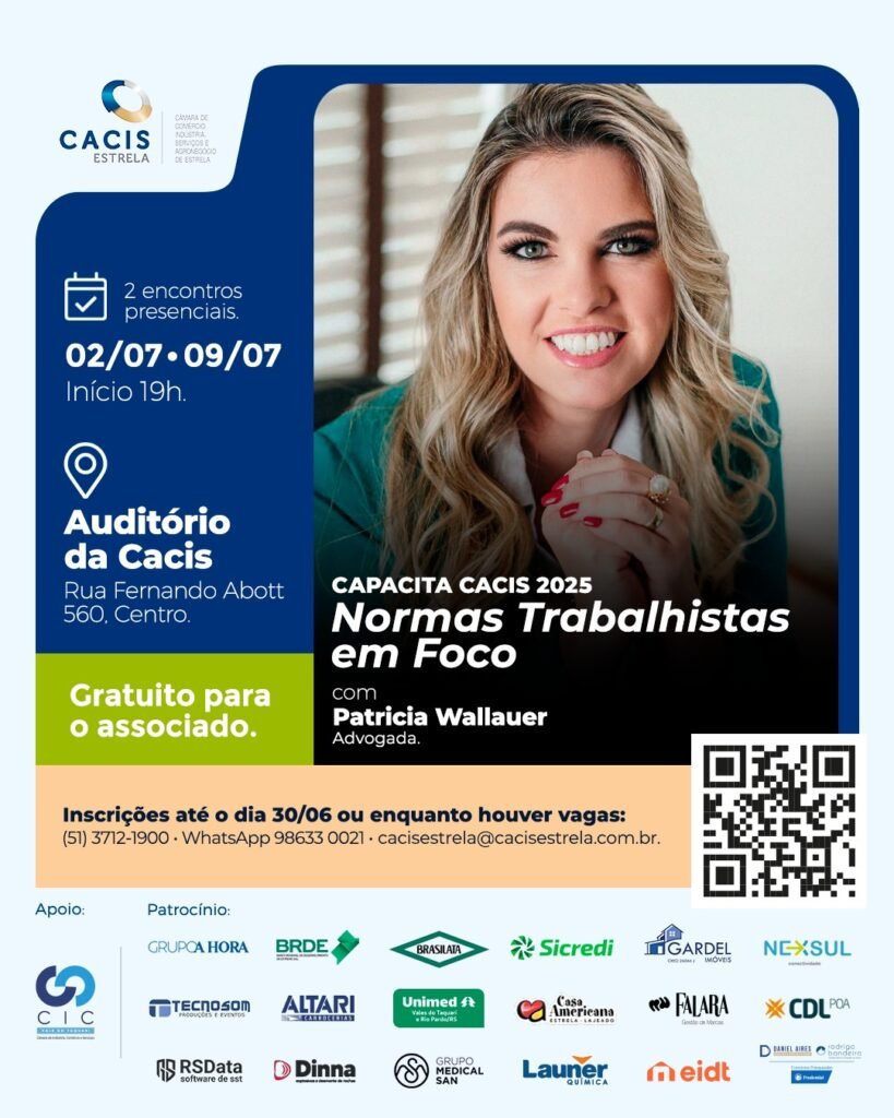 Três já foram realizados. Outros dois tiveram suas primeiras noites nas últimas semanas e serão completados nos próximos dias: “Comunicação não violenta”, com comunicadora e empresária Luciana Brune (24/06); “Prevenir é melhor do que remediar”, com a advogada Gabriela Perosso (15/07). Outro curso abre o lote de inscrições: “Normas trabalhistas em foco”, com a advogada Patrícia Wallauer. Dias 02 e 09 de julho, a partir das 19h. Inscrições até dia 30/06 (chamar Whats 51-98633-0021 ou pelo QR code do card de divulgação).