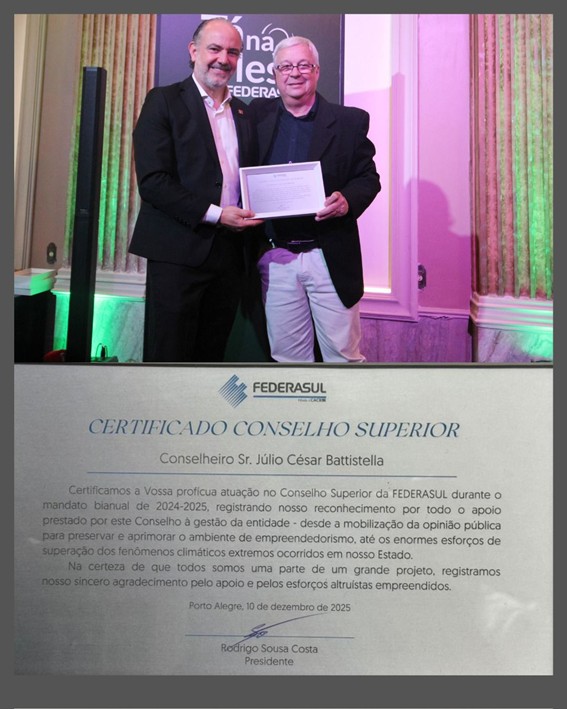 Entre os agraciados estava o empresário castilhense Júlio Cesar Batistella, membro do conselho superior que recebeu a homenagem por sua dedicação e contribuição aos desafios enfrentados pelo empresariado gaúcho no mandato 2024/2025. O encontro celebrou as vitórias e as lutas da entidade, como a mobilização contra aumentos de impostos e a superação dos impactos dos eventos climáticos no estado, entre muitos outros.