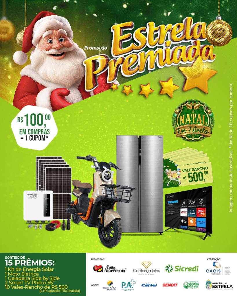 Este ano, além dos patrocinadores fixos, a Estrela Premiada conta com o apoio de STR Lajeado; Geração Própria; PA+; Certel; Benoit e Prefeitura Municipal de Estrela, sendo que também faz parte da programação do Natal em Estrela. Terá dois sorteios, dias 28/11 e 26/12, com diversificada gama de prêmios: serão 10 vales-ranchos de R$ 500 cada no Supermercado STR Lajeado (filial Estrela); 2 TVs de 55 polegadas; uma geladeira Frost Free 442 litros; 1 Moto elétrica da marca FZK Scooter; e 1 Kit fotovoltaico completo.