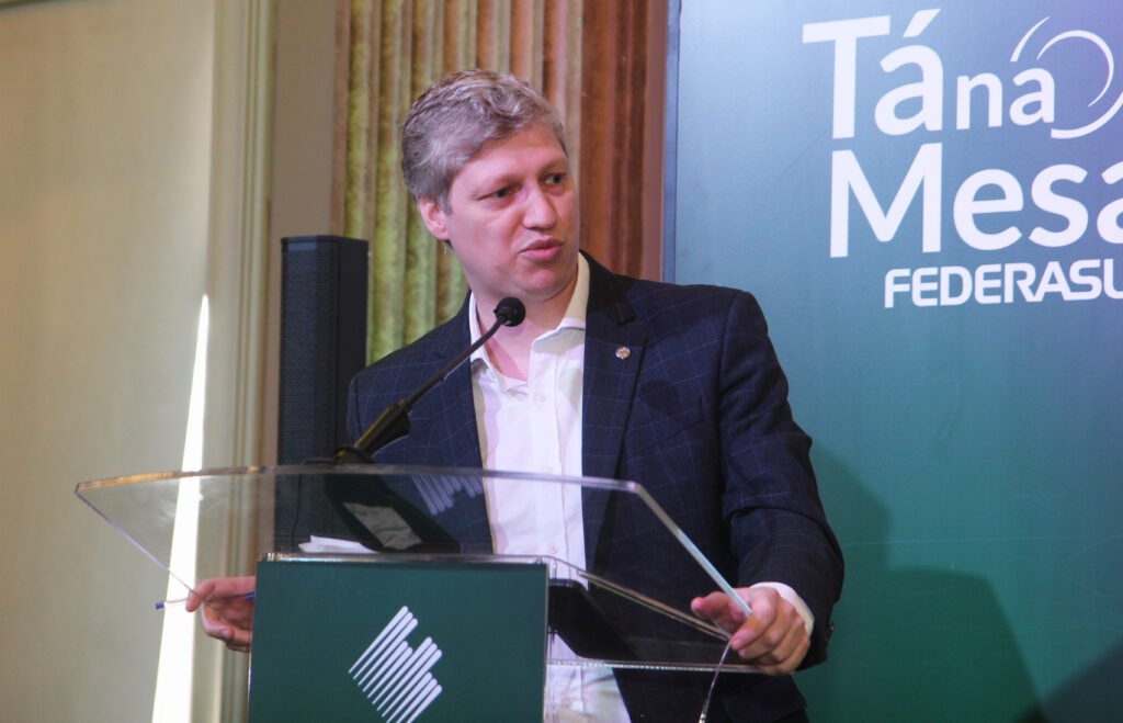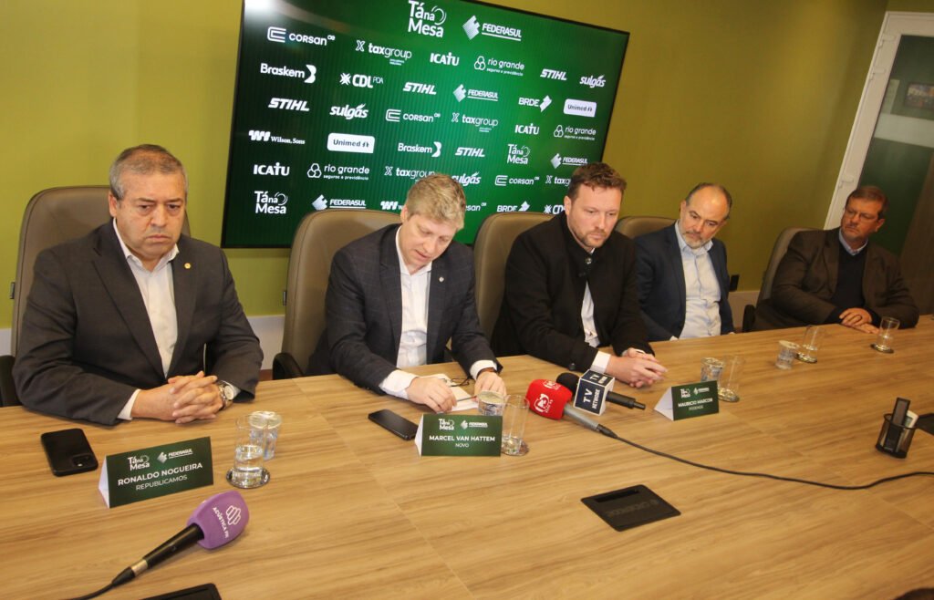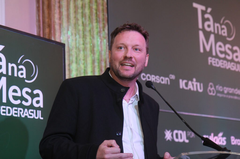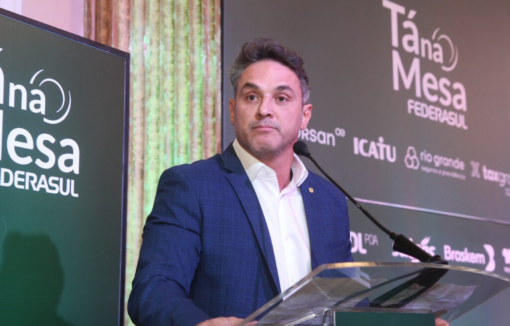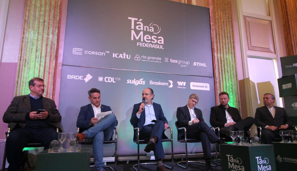 A tarifa de 50% imposta pelo presidente dos Estados Unidos, Donald Trump, aos produtos brasileiros –  que entra em vigor no dia 1° de agosto – e o impacto sobre a economia nacional foi o assunto predominante dos debates durante a reunião-almoço Tá na Mesa, da FEDERASUL, desta quarta-feira, 23. O evento reuniu cinco deputados federais do Rio Grande do Sul. São eles: Alexandre Lindenmeyer (PT), Luciano Zucco (PL), Marcel Van Hatten (Novo), Maurício Marcon (PODEMOS) e Ronaldo Nogueira (Republicanos).