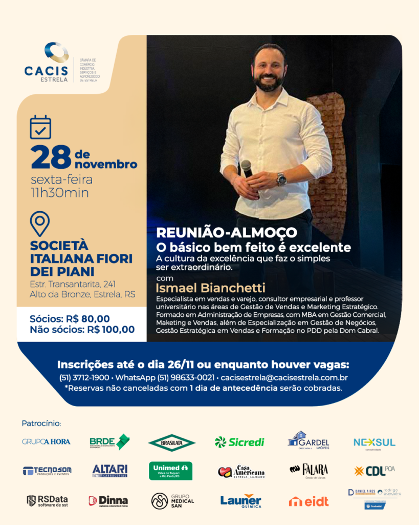 A tradicional Reunião-Almoço da Câmara de Comércio, Indústria, Serviços e Agronegócio de Estrela (Cacis) retorna nesta sexta-feira, 28 de novembro, para reforçar um princípio que atravessa gerações: fazer o simples com qualidade na obtenção de excelentes resultados. A oitava edição do ano, a ser realizada outra vez a partir das 11h30min, na Società Italiana Fiori dei Piani, terá como convidado o professor universitário e administrador de empresas Ismael Bianchetti, especialista em gestão comercial, marketing e vendas, com a palestra-tema “O básico bem feito é excelente” – a cultura da excelência que faz o simples ser extraordinário. Os ingressos seguem à venda.