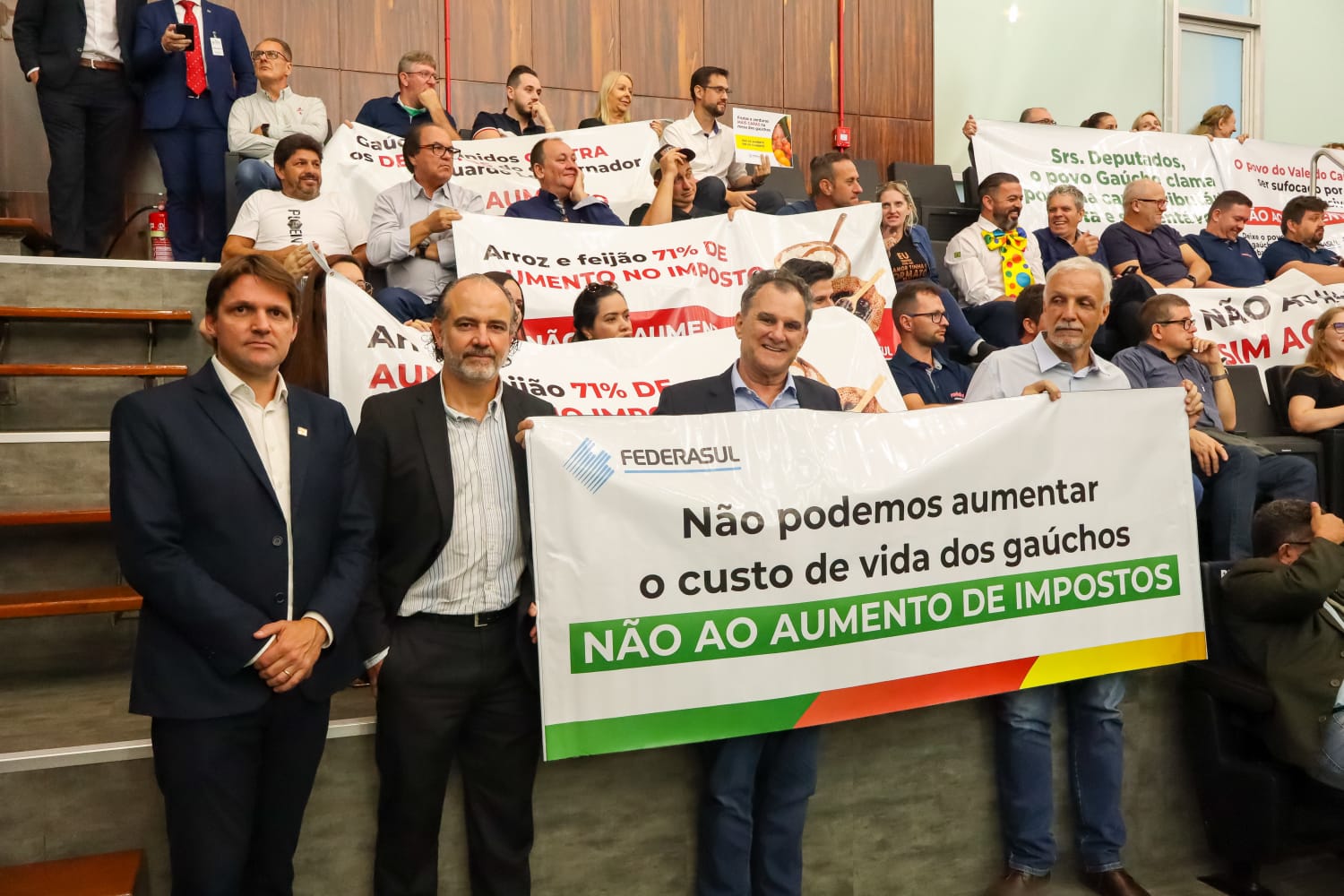 Faixas, palavras de ordem e até mesmo buzinaços na frente da Assembleia ilustraram o descontentamento da população gaúcha. Sindicatos, entidades, pequenos produtores rurais e também cidadãos agindo individualmente tomaram as galerias do Plenário.