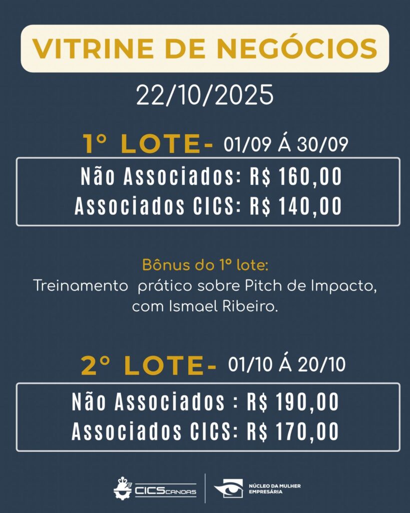 No primeiro lote, os valores são promocionais: R$ 140,00 para associados da CICS Canoas e R$ 160,00 para não associados. Além disso, quem garantir a inscrição neste lote recebe um bônus exclusivo: um treinamento prático de construção de pitch, ferramenta essencial para apresentar o negócio com clareza e conquistar novos clientes. Inscrições no Sympa: https://www.sympla.com.br/evento/vitrine-de-negocios-2025/3094397#compartilhar-evento?share_id=copiarlink